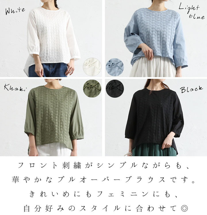 商品名: ブラウス シャツ 七分袖 綿100% インド綿 フロント刺繍ブラウス レディース 刺繍 プルオーバー シャツブラウス ギャザー レース トップス 涼しげ 五分袖 薄手 無地 コットン 体型カバー ゆったり 大きいサイズ 春 夏 クルーネック パフ袖 ぽわん袖 上品 花柄 インドコットン 天然素材 シンプル カジュアル きれいめ 大人 かわいい ナチュラル服 ルームウエア 部屋着 オフホワイト ライトブルー カーキ ブラック アイボリー キナリ サックス グリーン スミクロ チャコール 白色 青色 水色 緑色 黒色 くすみカラー フリーサイズ前身頃に 刺繍 を贅沢に施した、 プルオーバー ブラウス 。